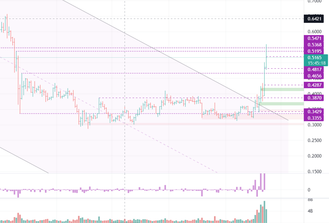 После такого роста проситься хорошая коррекция как минимум. Предполагаю что ближайшей целью снижения станет 0.4820, более глубокой до уровня ~0.4280. Всем успехов в торговле!