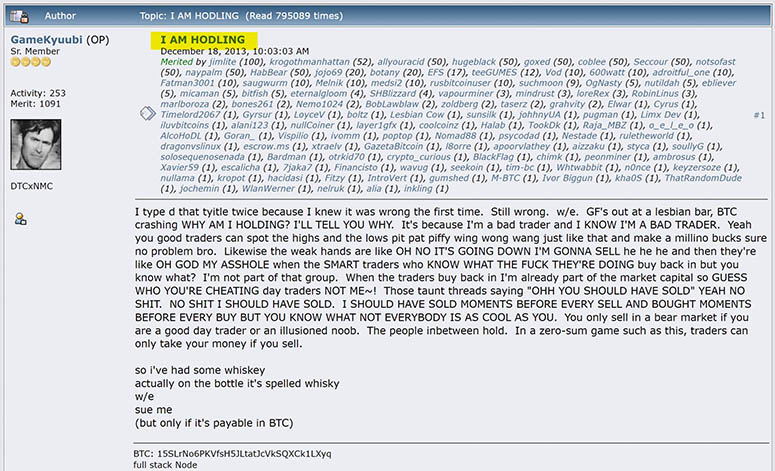 HODL — это, пожалуй, самый известный криптосленг, который попал в мейнстрим. Буквально это означает «держать» вашу криптовалюту, то есть «не продавать». В последние года ему было присвоено сокращение от Hold On for Dear Life, но на самом деле оно родилось из-за простой ошибки. Вот что произошло на самом деле.