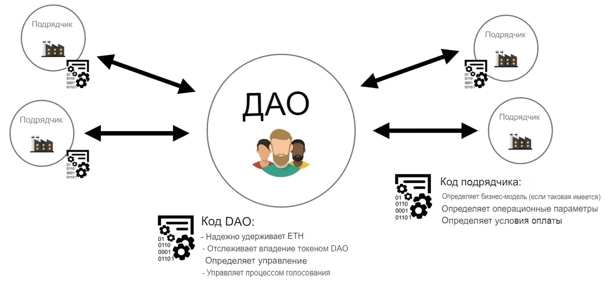 Аббревиатура означает Decentralized Autonomous Organisation (Децентрализованная Автономная Организация). Для координации участников используются специальные алгоритмы (смарт-контракты).