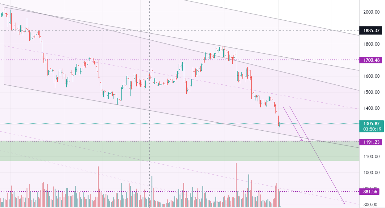 Цена эфириума по паре ETH/USD продолжает снижаться и на текущей неделе с 1780 до ~1305 на данный момент. Эфир в целом не смог закрепиться выше уровня 1400 и рухнул вниз под давлением продавцов. Скорее всего цена стремиться протестировать уровень покупок на ~1200 где еще формировалось нижняя граница канала на 4-х часовом графике.