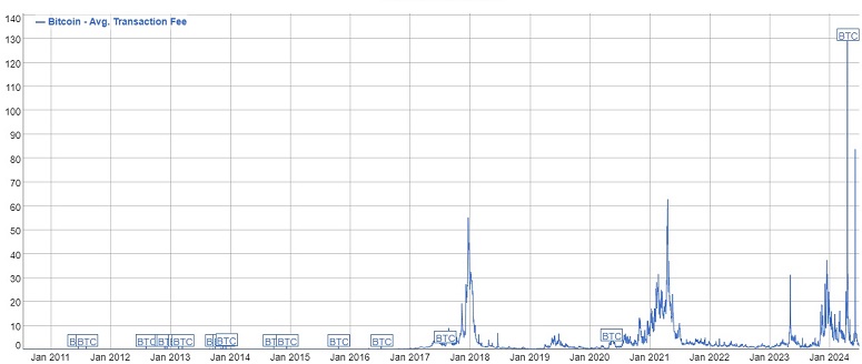 Первое впечатление от халвинга оказалось крайне положительным, поскольку одновременный запуск протокола Runes привел к рекордной загрузке сети и, как следствие, рекордному росту комиссий. Только за первый блок новой эпохи доход майнеров от комиссий составил 37,6 BTC против 3,2 BTC за его нахождение. Средняя комиссия в сети в тот день превысила $120, — и это тоже стало рекордом.