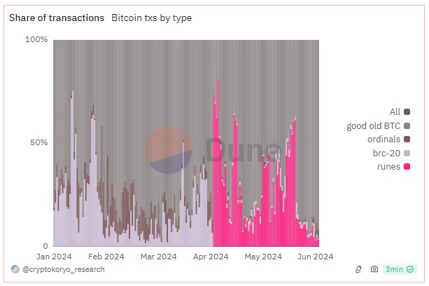 Однако ажиотаж вокруг новых цифровых объектов продлился недолго. Если в первые дни появления рун на их долю приходилось до 80% от всей емкости блоков, то последние дни они занимают скромные 3-4%.