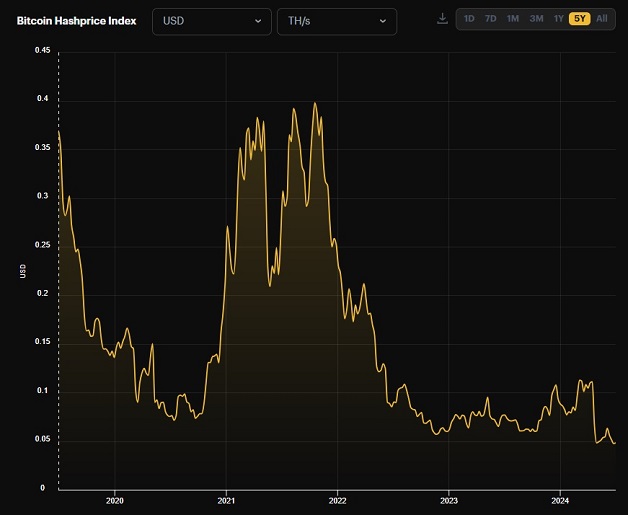 Комиссии сети вернулись к минимальным уровням. Как результат, доходность от терахеша мощности установила новый антирекорд, опустившись ниже $0,05.