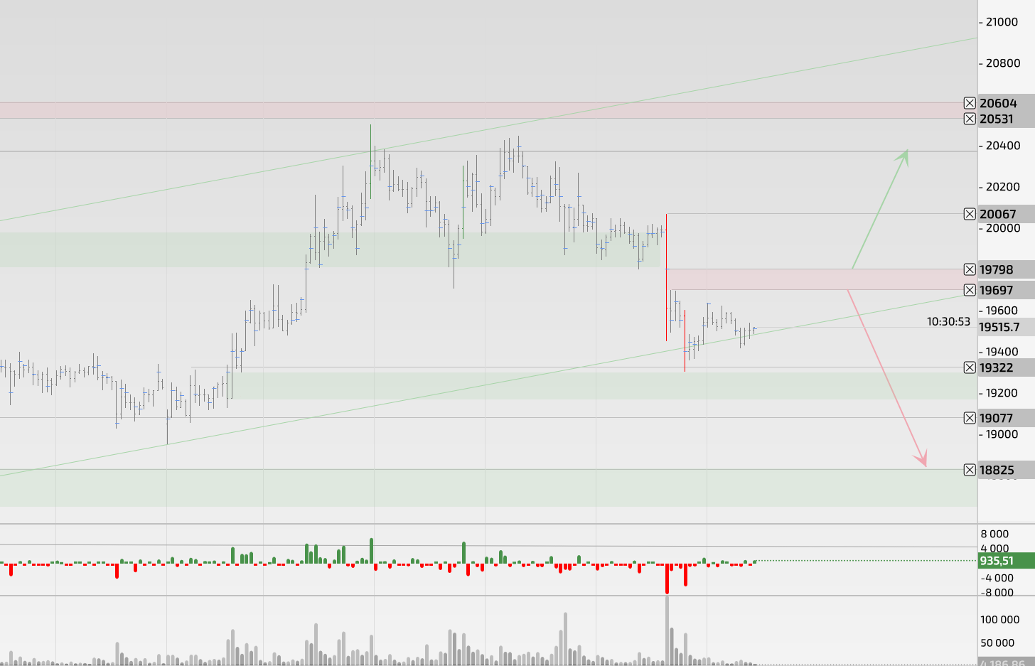 В случае дальнейшего снижения, ожидаю цену на уровне 19322/19080 и конечная цель на ~18825. Все зависит как ситуация разрешится локально на уровне ~19700 где будет тест продавливания покупателя от 30 сентября.