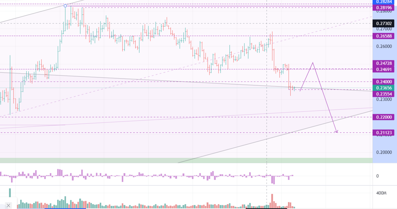 На протяжение недели цена по паре CHZ/USDT снижается до уровня покупателя на ~0.2400. В моменте цена находится на уровне 0.2365 и предпринимает попытку сделать локальную коррекцию в район уровней 0.2470-0.2520. Предполагаю что до конца торгового дня сможем увидеть данный локальный рост CHZ, а пока цена будет болтаться в указанном районе. Если предположение верно насчет локальной коррекции, то новыми целями снижения цены могут стать 0.2200-0.2112.