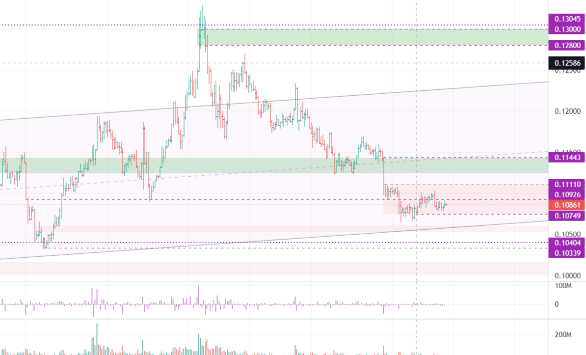 На дневном графике XLM/USDT цена находится в боковом канале 0.1300-0.1040, выход в ту или иную сторону даст новый импульс для роста/падения XLM. Если не армагедонить, то цена может еще упасть в район уровней 0.0950-0.0910.