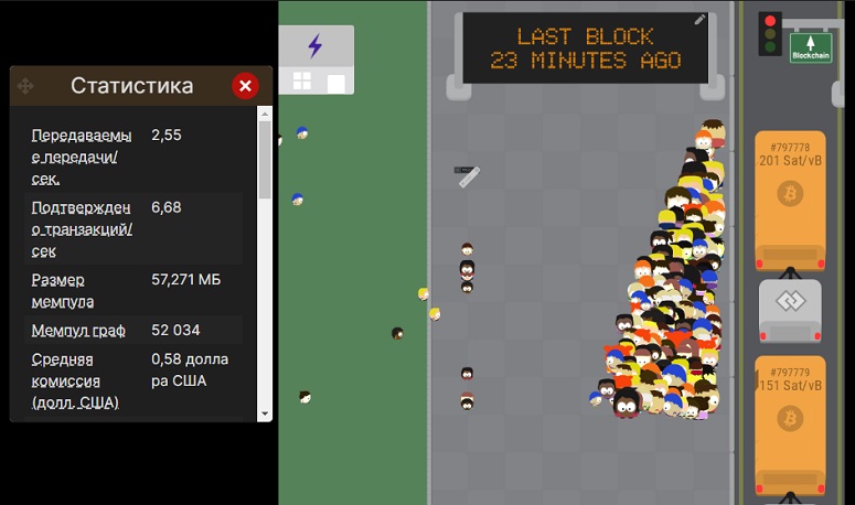 На момент создания статьи в мемпуле ждут подтверждения более 150 000 транзакций, а средний блок Bitcoin содержит от 1500 до 4000 транзакций. При этом новый блок создается в среднем один раз в 10 минут. Из-за этого транзакции застревают в мемпуле. Увеличивается время обработки.