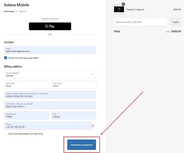 Заполним форму на оплату, и тут спрашивают Billing Address, а это обозначает платёжный адрес. И по идее на него вообще всё равно, потому что на следующем шаге мы будем платить USDC в Solana.
