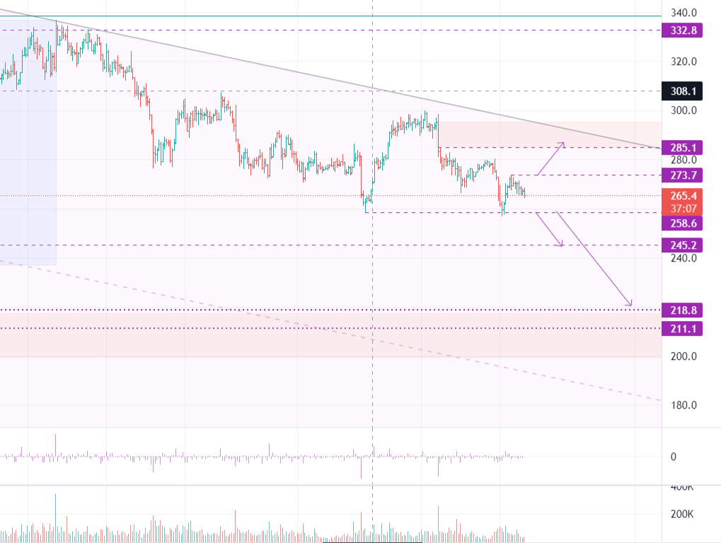 На протяжении месяца BNB/USDT продолжает снижаться вяло обновляя новые минимумы. Сегодня ценна обновила вчерашний минимум на уровне 256, выросла и колеблется на момент на ~265. Ключевой уровень на сегодня служит 273.3 и в случае обновления его ожидаю цену в районе 285 вблизи верхней границы нисходящего канала на 4-х часовом графике. Если BNB закрепиться выше канала то цели будут красивыми — в диапазоне 340-370.