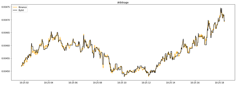 На графике видно, что котировки то JASMY к USDT на биржах Binance и Bybit периодически различаются, в эти моменты возникает арбитраж.