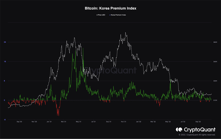 Источник: CryptoQuant. зеленая линия: Korea Premium Index, белая линия: цена BTC в USD