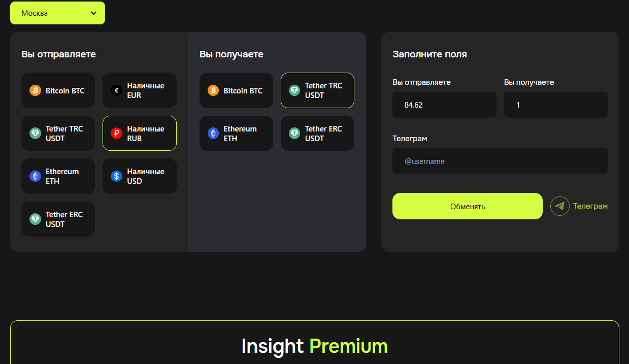 Криптообменник Insight — это одна из наиболее надёжных платформ для обмена криптовалюты в Москва Сити. Он предлагает широкий выбор криптовалют для обмена и акцентирует внимание на удобстве и безопасности сделок. В этом обменнике можно легко и быстро обменять популярные криптовалюты на рубли и другие фиатные валюты.