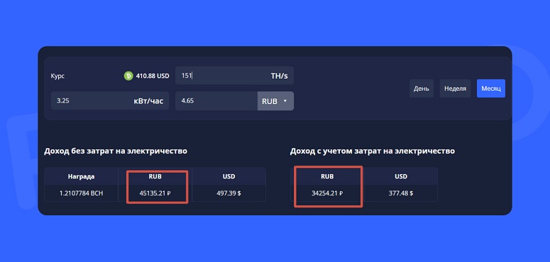 Таким образом, за месяц можно получить 45 135,21 рублей без затрат на электроэнергию и 34 254,21 рублей уже с учётом расходов на электричество. Разница в доходе от майнинга BTC и BTH небольшая, но многое зависит от того, как себя ведёт рынок.