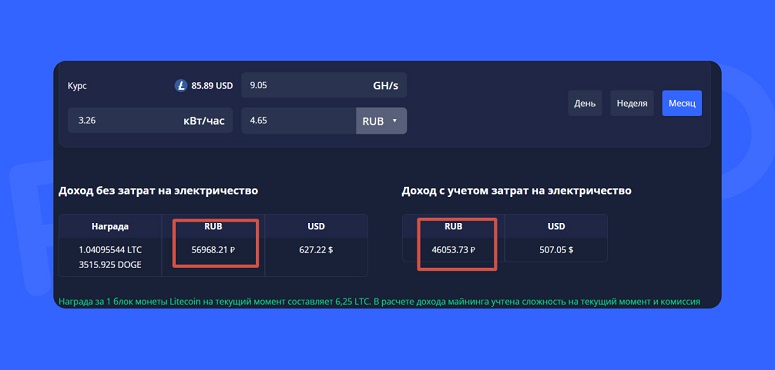 На асике Antminer L7 за месяц вы сможете получить 56 968,21 рублей без затрат на энергию и 46 052,73 рублей, если учитывать расходы на электричество.