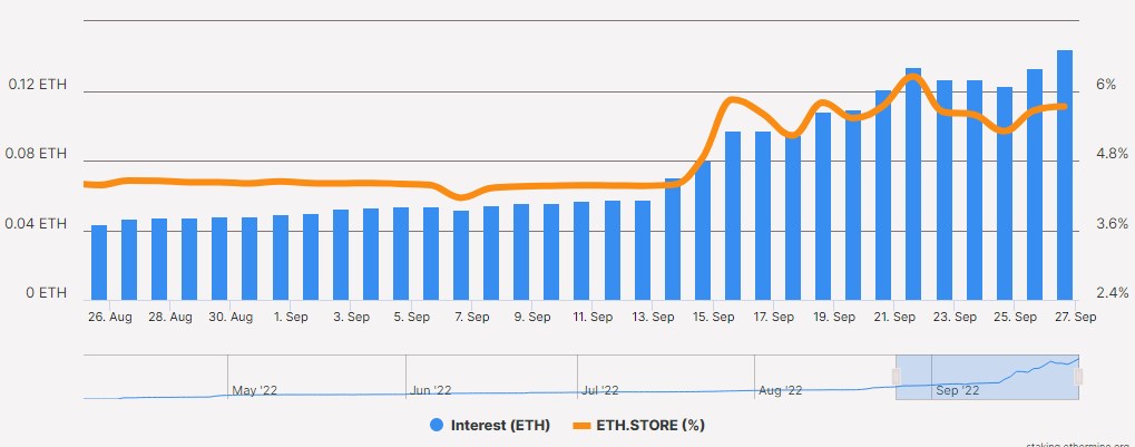 ETH.STORE отражает среднюю доходность, полученную валидаторами в сети Ethereum за 24 часа. Плавающая процентная ставка представляет собой базовый размер прибыли, которую можно ожидать от размещения эфира. Например, в начале сентября процентная ставка составляла 4,429% годовых. В целом за месяц показатель колебался в диапазоне 4,16-6,25%.