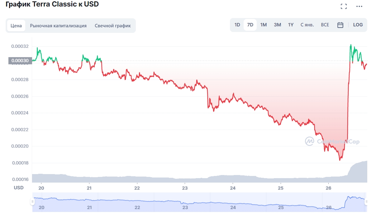 Согласно данным CoinGecko, цена LUNC подскочила на 60%, достигнув $0,00032. На момент написания поста токен переходил из рук в руки по цене около $0,00029.