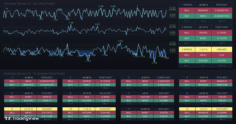 Ниже представлен индикатор на платформе TradingView для отслеживания арбитражных ситуаций по выбранной монете: