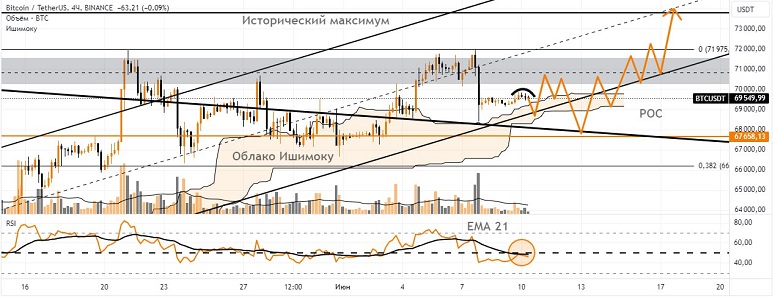 #BTC (четырехчасовой график). Отскок биткоина встретил сопротивление продавцов в районе $69 860. Линия RSI была остановлена экспоненциальной средней скользящей EMA 21, значения индикатора по-прежнему находятся под отметкой 50. Поэтому ожидаю снижение актива к нижней границе восходящего канала, которая должна выступить уровнем поддержки для ценового движения. Затем вероятен рост инструмента к уровню сопротивления $70 700, откуда вновь возможна коррекция.