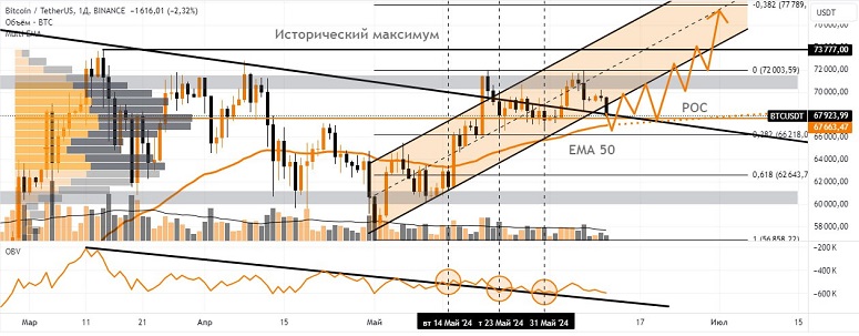 #BTC (дневной таймфрейм). Попытка биткоина развить восходящее движение была остановлена на отметке $70 225, откуда началась рассматриваемая в последних обзорах коррекция инструмента. Актив пробил нижнюю границу восходящего канала, добравшись до отметки POC ($67 700). Реакция покупателей на тест ценой этой зоны пока довольно слабая. Вероятен спуск биткоина к экспоненциальной средней скользящей EMA 50 D, которую актив не тестировал с момента ее преодоления в середине прошлого месяца.