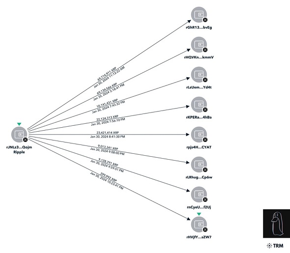 Помимо упомянутого rJNL* явными признаками взлома обладает адрес ru1B*, который точно так же 30 января был опустошен несколькими траншами. С этих адресов часть средств перекочевала уже на rs1*. Чтобы было понятнее, расставим акценты: rJNL* и ru1B* – это кошельки Ларсена; а rs1* – кошелек мошенника.