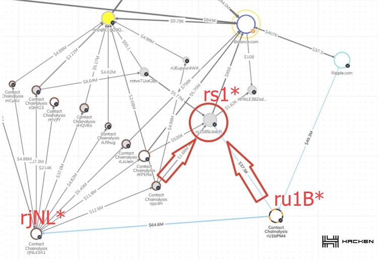Дальше средства с rs1* уходят на криптобиржи, где наибольший интерес представляет Kraken c адресом rLHz*. Мошенник, вероятно, использует его для обналичивания средств, заключают аналитики. Но как объяснить тот факт, что тот же rLHz* ранее (задолго до взлома) использовал сам Ларсен, напрямую отправляя средства с ru1B*?