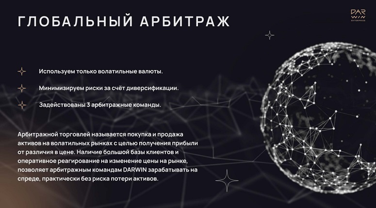 - Global Arbitrage — пул арбитража с доходностью 2-3% в неделю. Вы можете пополнить пул, предоставив команде арбитража средства для работы — и взамен на это получать часть прибыли в виде пассивного дохода.