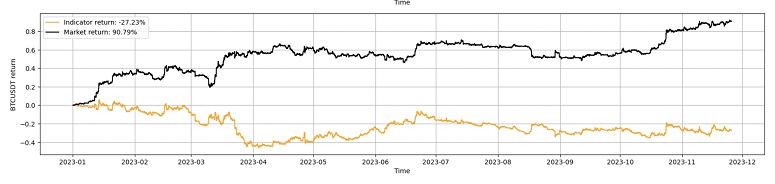 Теперь давайте возьмем реальные данные BTC, SOL, DOGE (можно любые, но я выбрал случайно эти) и сделаем бэктест. Индикатор SMA будем считать работающим, если на горизонте год, P&L 2-х из 3-х активов будет больше чем P&L buy-and-hold, при этом нам по факту не важно какой актив, должно работать на любом активе. Мы не будет учитывать комиссии, проскальзывание и задержку, что снизить реальный P&L это стоит держать в голове. Ниже графики на часовых таймфремах за последние 2 недели (срок выбран, так чтобы график можно было прочитать)