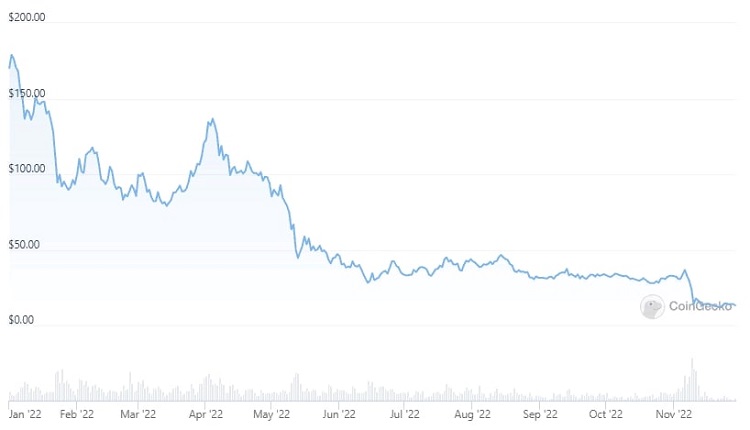 На максимуме в ноябре 2021 года SOL стоила около $258. В ноябре 2022 криптовалюта торгуется за $14. По оценкам экспертов, решающим фактором, оказавшим влияние на потерю устойчивости Solana, стало банкротство криптовалютной биржи.