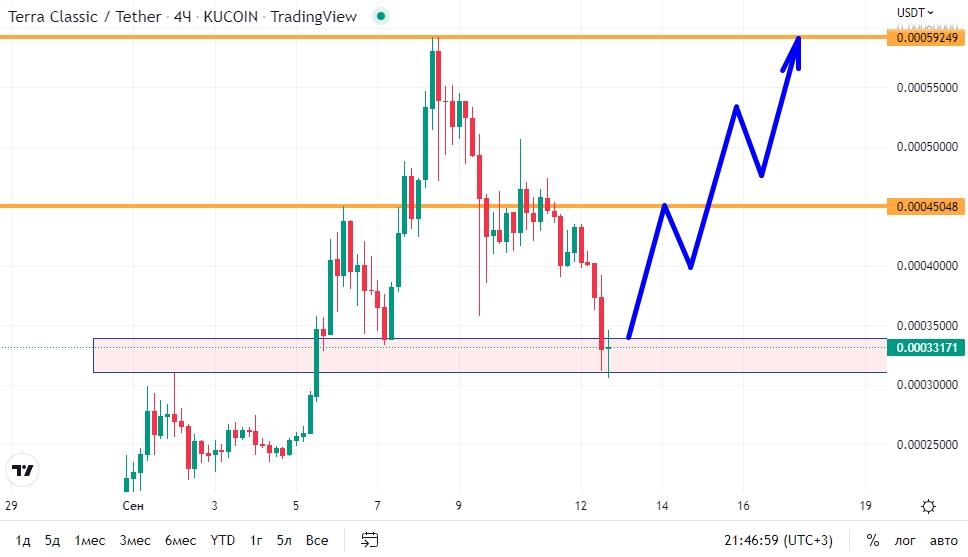 Приветствую всех ярых криптоэнтузиастов! 😉 Итак, вечер 12 сентября и на графике H4 Terra Classic я наблюдаю, что котировки расположились в значимой зоне спроса: