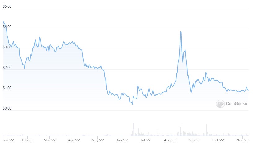 Крах этой финансовой платформы стал одним из самых громких в сфере DeFi. В июле 2022 года Celsius Network заморозила вклады клиентов на миллиарды долларов. Компания подала заявление на банкротство и обязалась продать немногочисленные оставшиеся активы на аукционе. Эта череда событий ожидаемо негативно отразилась на нативной криптовалюте платформы — CEL. По данным Coingecko, в начале ноября цена токена колеблется в диапазоне $0,90-1. За октябрь курс упал более чем на 30%. Год назад токен торговался почти за $7, в апреле 2022 CEL стоил $3.