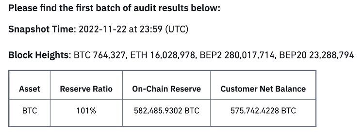 В документе, составленном Mazars, содержится мало сведений о структуре бизнеса Binance. В результате учтенные аудитором обязательства по BTC на 3% превышают активы криптобиржи в биткоинах. На момент составления отчета (22 ноября 2022 года) BTC-резервы Binance были покрыты только на 97%.