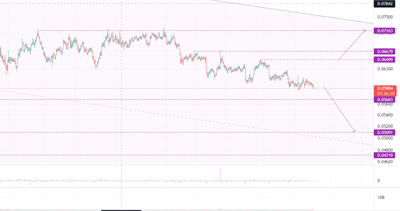 Если рассмотреть последний отрезок графика то цена стремиться дойти до нижней границы бокового канала 0.0568 и если закрепиться ниже то в среднесрочной перспективе можем увидеть падение цены до другого месячного минимума на уровне 0.0509.